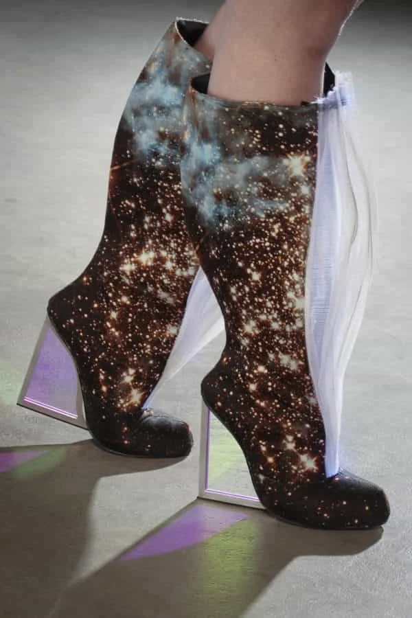 “Haute couture creations are snapshots of innovation and symbiosis of everyday need in fashion. What are the limits of capturing divine inspiration? Amber Ambrose Aurèle suggests capturing light in the Coruscate Imprisonment collection through print design and clever footwear engineering. Striving not to demonstrate only the romantic and swift beauty that is often found in modern-day fast fashion, Amber created one of a kind shoes that light up in the dark powered by LED-fabric.